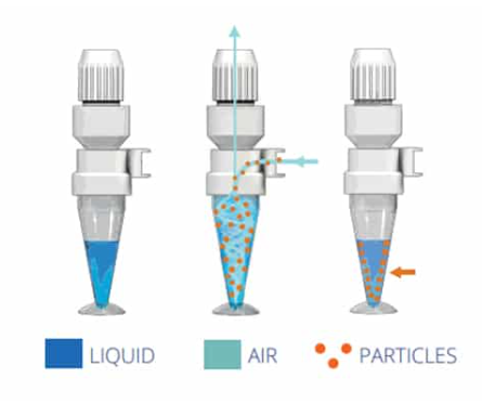 Stożek kolekcyjny, wstępnie napełniony odpowiednim płynem do poboru próbek, jest umieszczany w samplerze. Po uruchomieniu Coriolis+ generuje wir w stożku kolekcyjnym. Cząstki, takie jak bakterie, wirusy, pleśń, zarodniki, pyłki czy toksyny, są odwirowywane na wewnętrzne ścianki stożka i oddzielane od powietrza. Następnie próbka jest gotowa do kolejnych etapów analizy mikrobiologicznej.